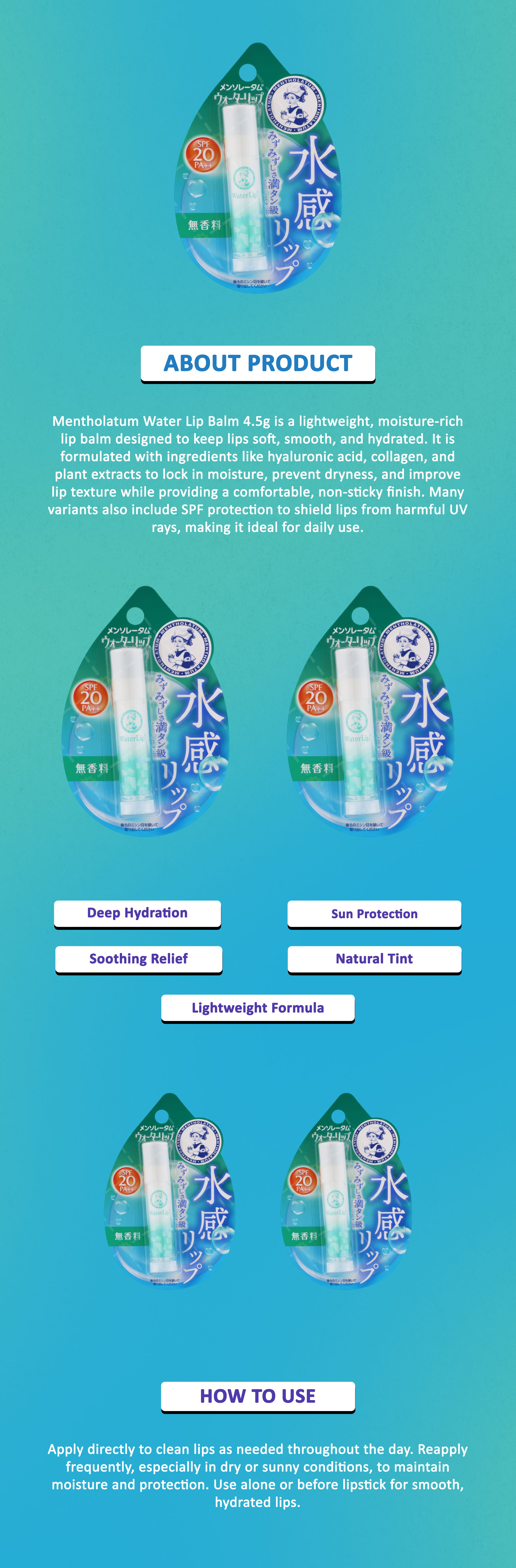 Mentholatum Water Lip Balm evenly to clean, dry lips whenever they feel dry or