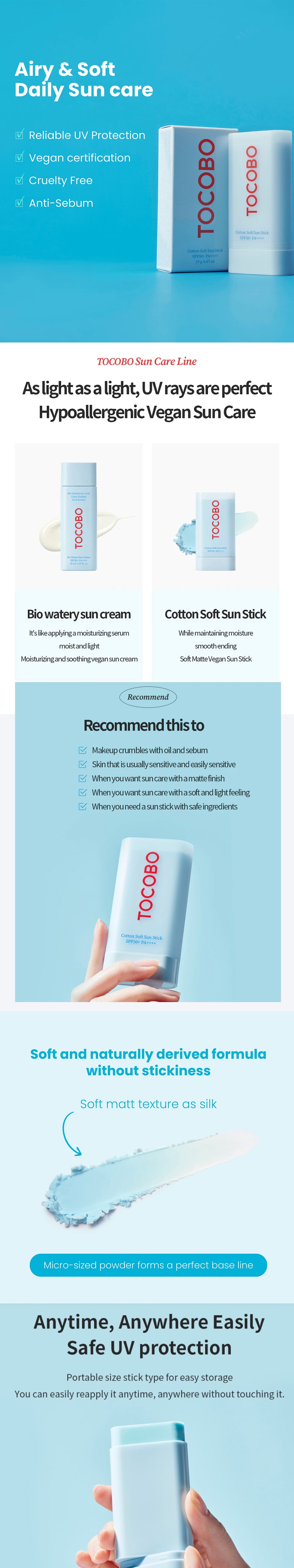 - Tocobo Cotton Soft Sun Stick SPF50+ PA++++ is a cruelty-free, vegan-verified brand.
